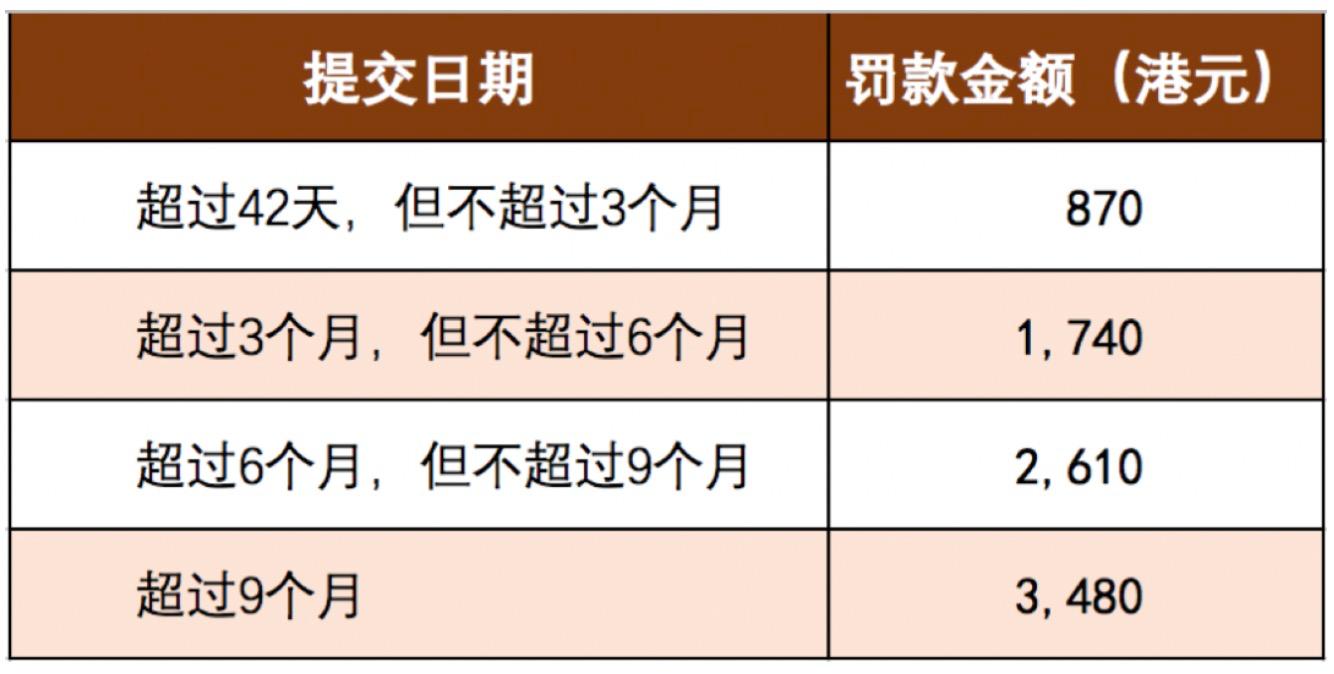 1、周年申報(bào)表需要公司在年審日后42天內(nèi)向香港公司注冊(cè)處提交,內(nèi)容包括公司的最新信息以及信息變動(dòng)。如果沒(méi)有按時(shí)進(jìn)行申報(bào),將會(huì)產(chǎn)生大額罰款,并且超時(shí)越多累積越多,如下圖所示: